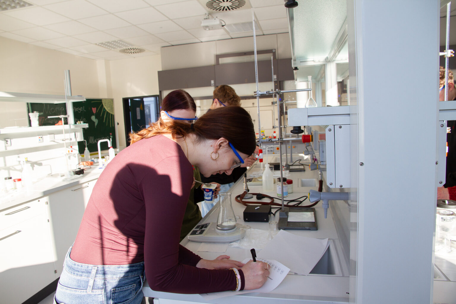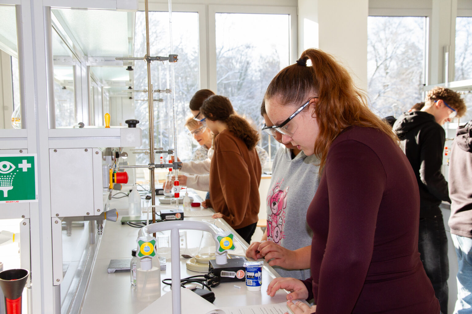 Die Schüler schlüpften in die Rollen von Laboranten und machten sich daran, die Milchsäure in verschiedenen Joghurt-Proben zu bestimmen. „Ist dieser Joghurt mild genug, oder ist er zu sauer?“, fragten sich die Schüler, die auch eigene Proben mitgebracht hatten. Mit einer sogenannten Bürette wurde jeder Tropfen einer Natronlauge sorgfältig abgemessen. Dabei verwandelten sich die Proben in eine rosa Flüssigkeit, die wie leckere Himbeermilch aussah! Probieren durften die Schüler natürlich nicht.