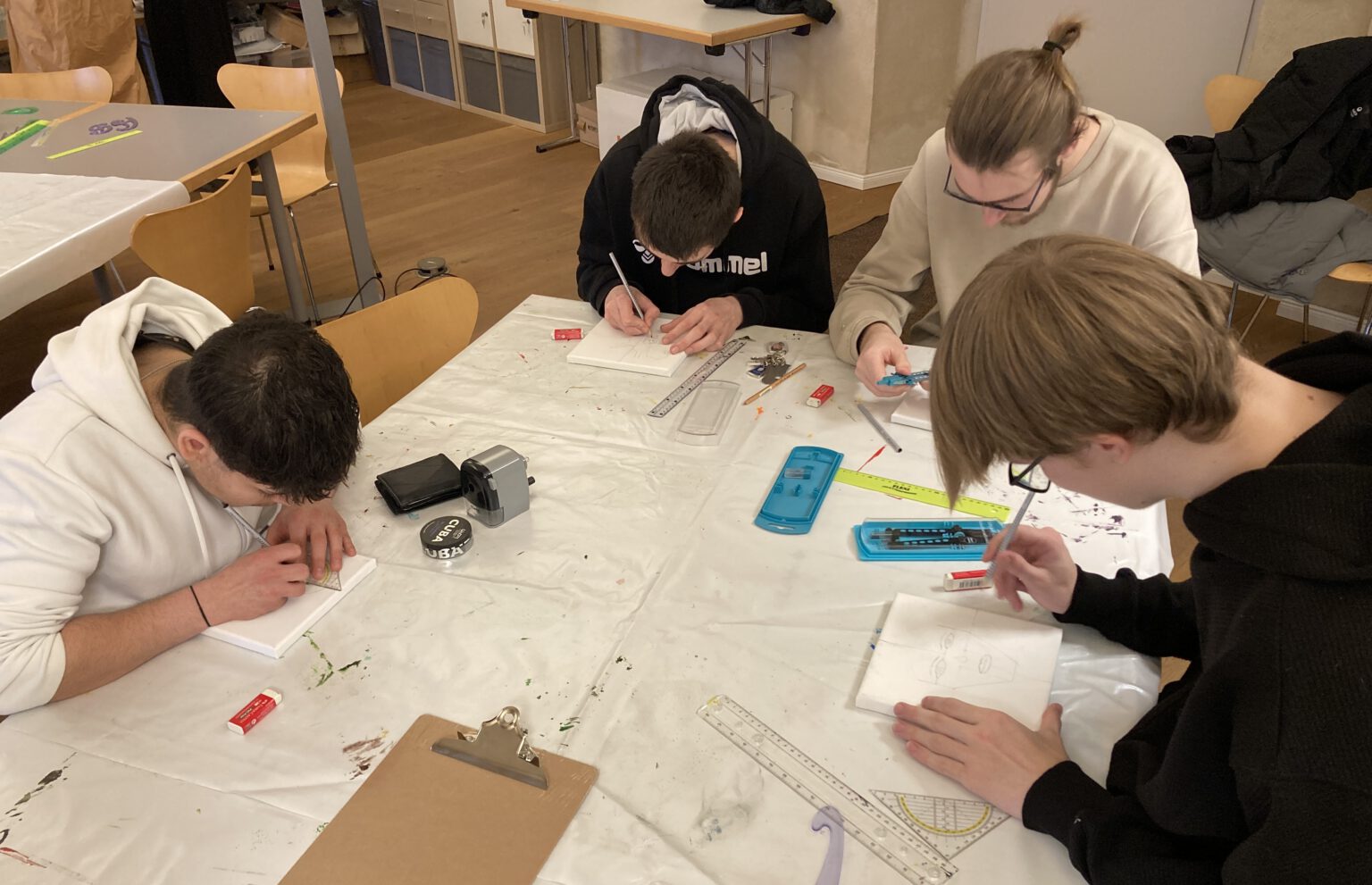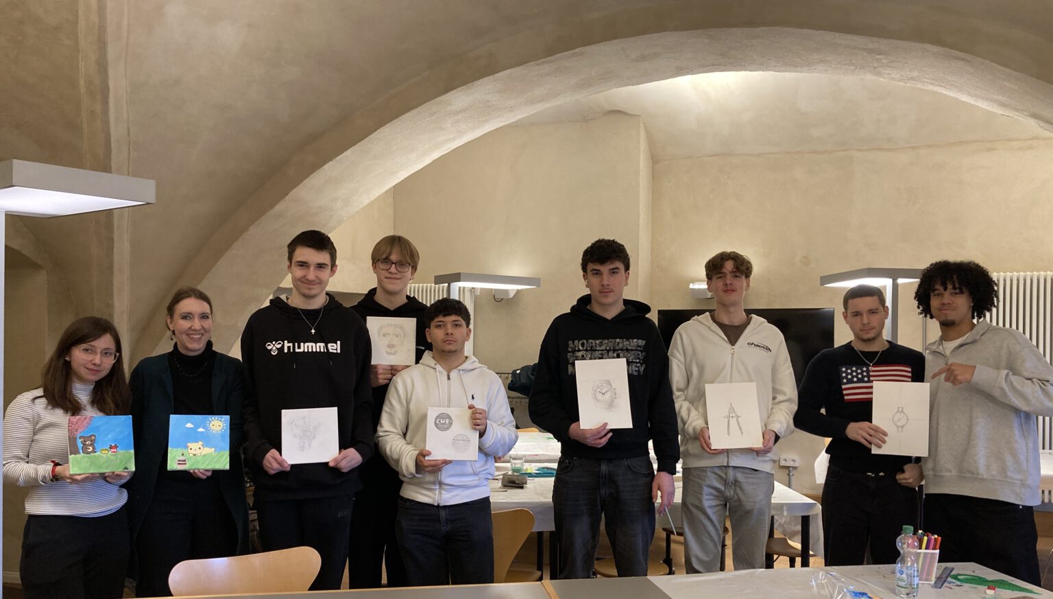 Nach der Führung folgte der Praxisteil im Gewölbekeller des Schlosses, der als Kunstatelier dient. Mit verschiedenen Materialien und Farben ließen die Schülerinnen und Schüler ihrer Kreativität freien Lauf und schufen inspiriert von der Ausstellung individuelle Bilder. Hier wurde nicht nur das künstlerische Schaffen, sondern auch der Teamgeist und die Zusammenarbeit innerhalb der Gruppe gefördert.