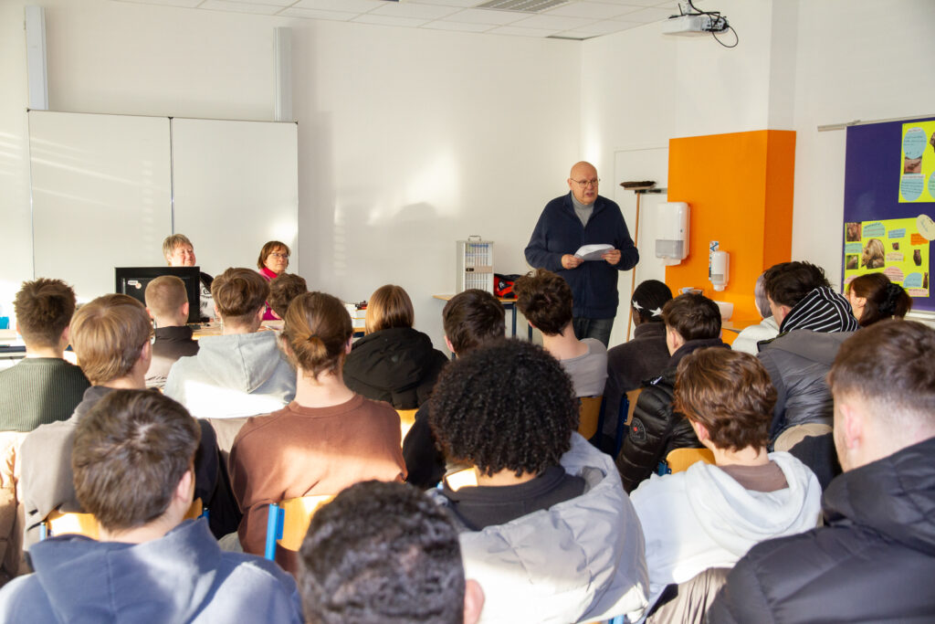 Es war mucksmäuschenstill am 21. Januar während zwei Autor*innen 31 Schüler*innen aus der TBO, TBM, TBU und vier Lehrkräften selbstverfasste Geschichten vorlasen. Nach einer kurzen Vorstellung und Einführung las zunächst Manfred Kindler, ein biomedizinischer Ingenieur, der mehr als 30 Jahre lang als Entwicklungshelfer in ca. 120 Ländern tätig war, eine Geschichte vor, die in der Zukunft spielt. Dabei ging es um KI und Alexa und es wurden auch ethische Aspekte angesprochen.