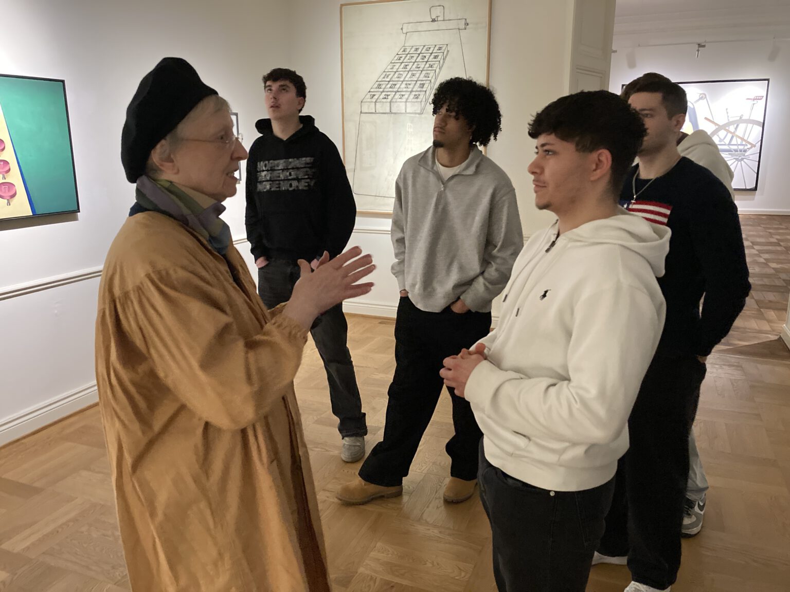Die Kunsthistorikerin Petra Mecklenbrauck geleitete die Gruppe durch die Ausstellung und teilte spannende Interpretationen zu Klaphecks Ölgemälden und Skizzen mit. Die Werke zeigen Werkzeuge und Maschinen, die erst durch ihre Titulierung vermenschlicht werden und die Fantasie zur eigenen Interpretation anregen. So wird ein Bügeleisen beispielsweise zum „Hausdrachen“ und zwei Telefone zu „eifersüchtigen Brüdern“.