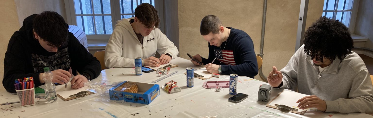 Nach der Führung folgte der Praxisteil im Gewölbekeller des Schlosses, der als Kunstatelier dient. Mit verschiedenen Materialien und Farben ließen die Schülerinnen und Schüler ihrer Kreativität freien Lauf und schufen inspiriert von der Ausstellung individuelle Bilder. Hier wurde nicht nur das künstlerische Schaffen, sondern auch der Teamgeist und die Zusammenarbeit innerhalb der Gruppe gefördert.