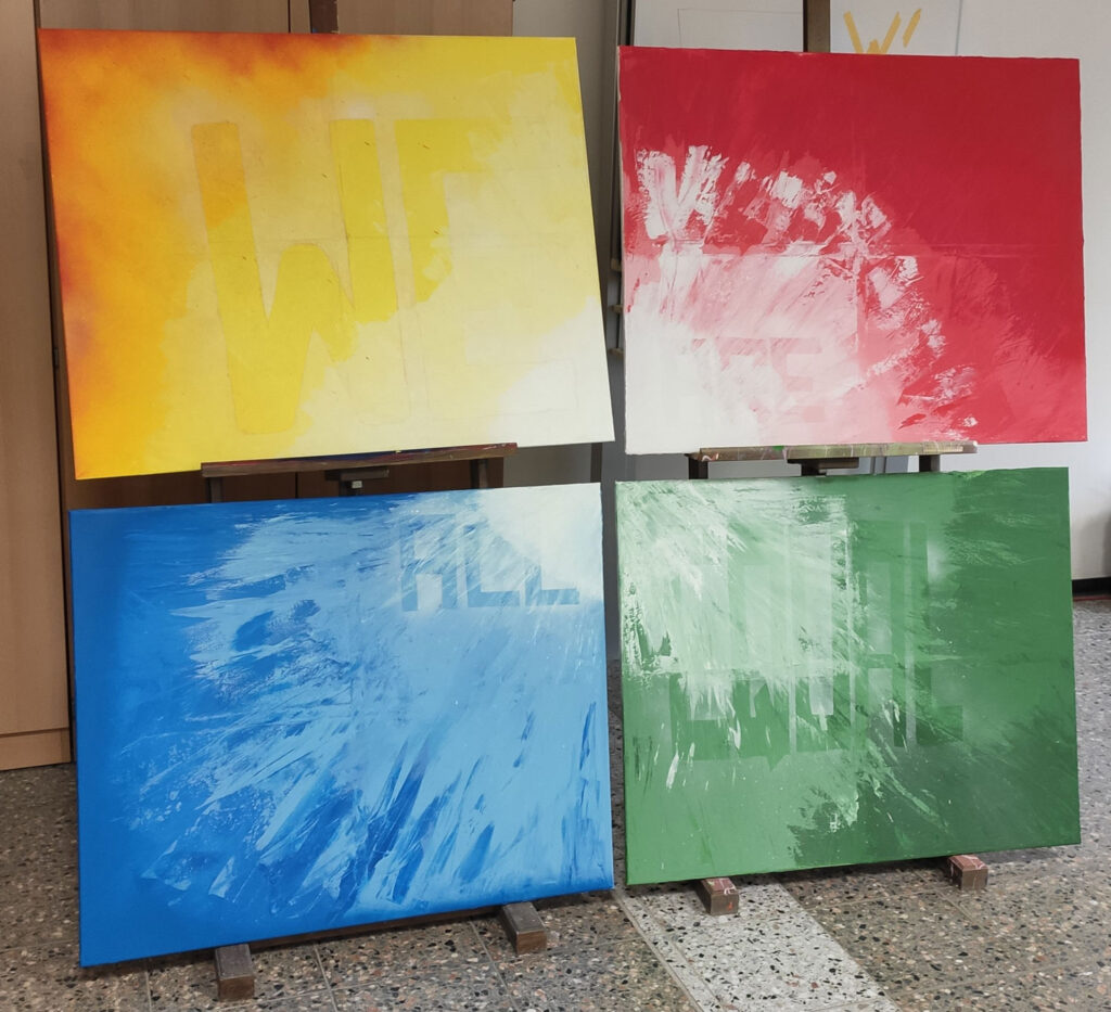 Aus dieser kreativen Auseinandersetzung sind vier großformatige Leinwände entstanden, die das Thema Gleichwertigkeit und Vielfalt künstlerisch sichtbar machen. Jede Leinwand setzt dabei eigene farbliche und gestalterische Akzente und lädt zum Nachdenken und zum Austausch ein.